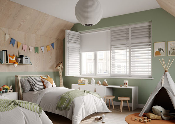 Experience the perfect blend of style and function with our Shutter and Shade collection. Merging the timeless look of plantation shutters with the light-blocking power of room-darkening blinds, this innovative design is ideal for bedrooms, nurseries, and home theaters. It effectively blocks outside light, enhances privacy, and promotes better sleep—all while adding a touch of elegance to any room.